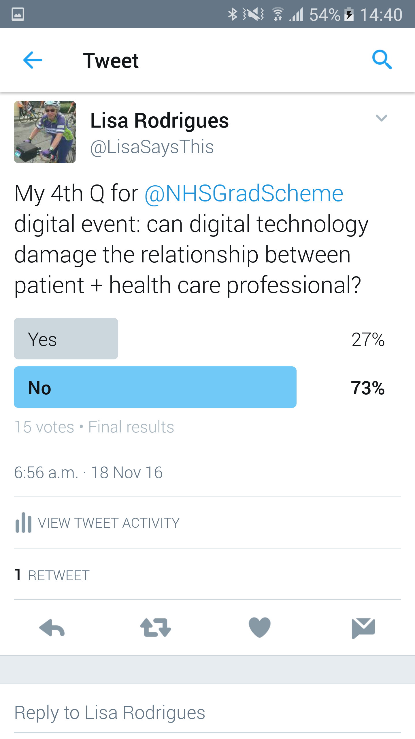 Again, although hardly a representative sample, my Twitter replies accorded with the audience. They said that attitudes mattered as much if not more than IT. I told them the story of a medical colleague who would write to me every six months or so during my 13 years as an NHS CE listing everything that he felt was wrong with how I was leading the trust, including the inadequacy of his secretarial support, in a 3 -4 page letter typed, somewhat ironically, by his secretary. I would always reply, by email. By contrast, my own psychiatrist, a world renowned professor at another trust, personally typed his update letter to my GP during our consultation and gave it to me to pass on. He would have used email but it wasn’t yet sufficiently secure.